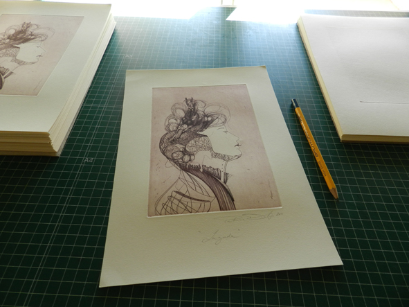 After a fantastic week working, eating, even dancing, and sharing experiences with other graphic artists, during the VII International Graphic Symposium Mojmirovce, each of us made an engraving on the theme: “Horses”. This is my version called “Lacing.” A hundred prints has been printed by Martin Stepanek of any etching, and right now, every author have received it back to sign it. Once ready and packaged again, they have returned to Slovakia.